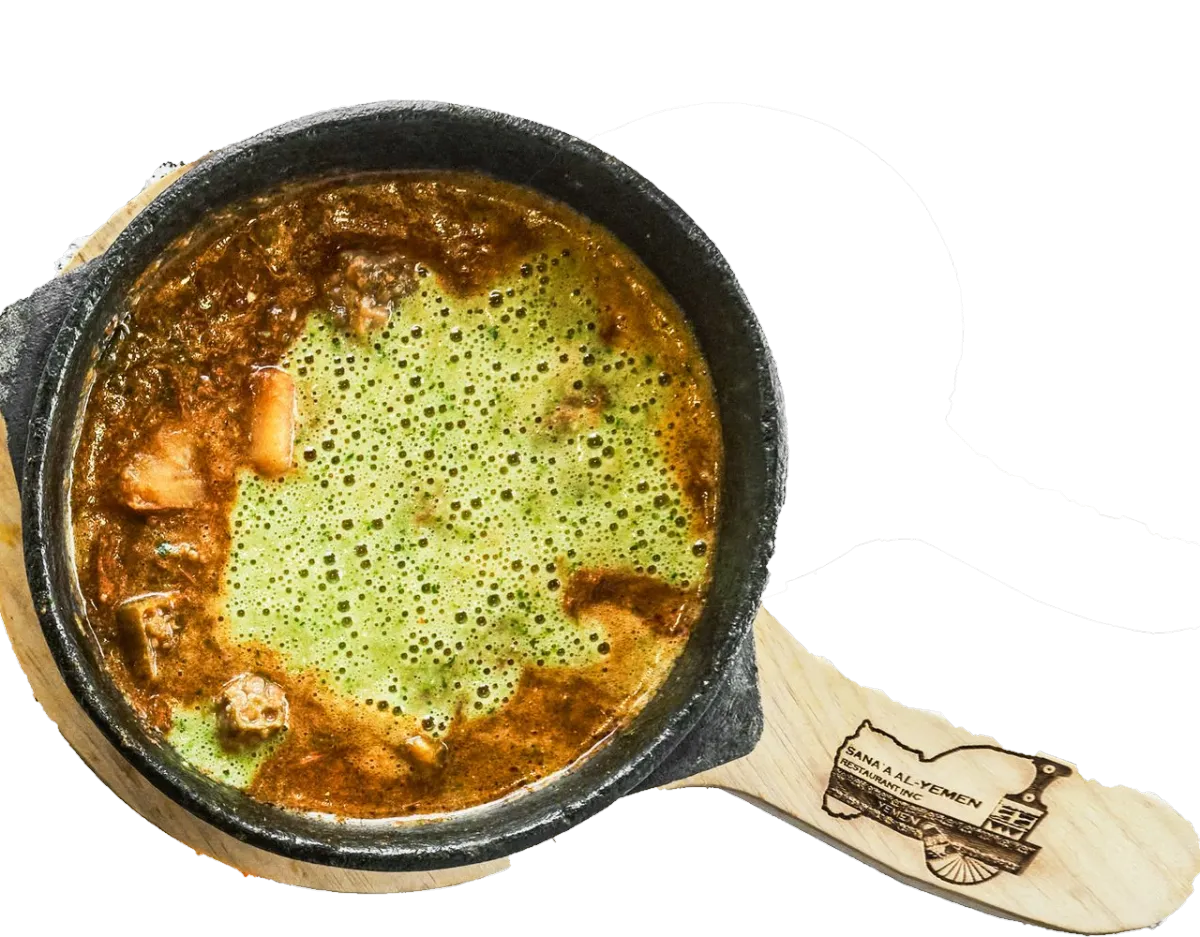 Yemen’s most popular dish, served hot with broth, vegetables, meat, and traditional fenugreek topping.